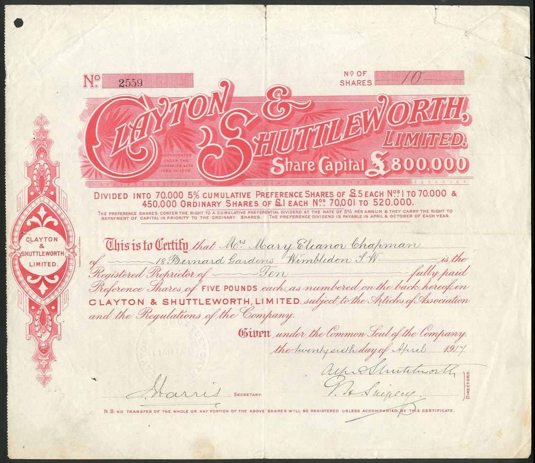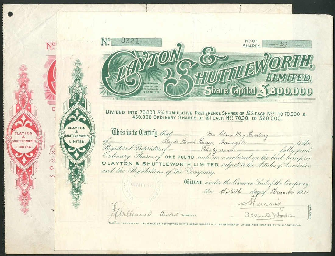 Great Britain: Clayton & Shuttleworth Limited, £5 preference shares, 19[17], #2559, signed by Alfred Shuttleworth as director, red, together with £1 ordinary shares, 19[21], #8321, green. Originally established in 1842 making steam engines and threshing machines. Converted to a Limited company in 1901. Most famous for its steam traction engines the company also made tractors and built many aircraft during WWI, notably the Sopwith Camel. GF and VF (2).