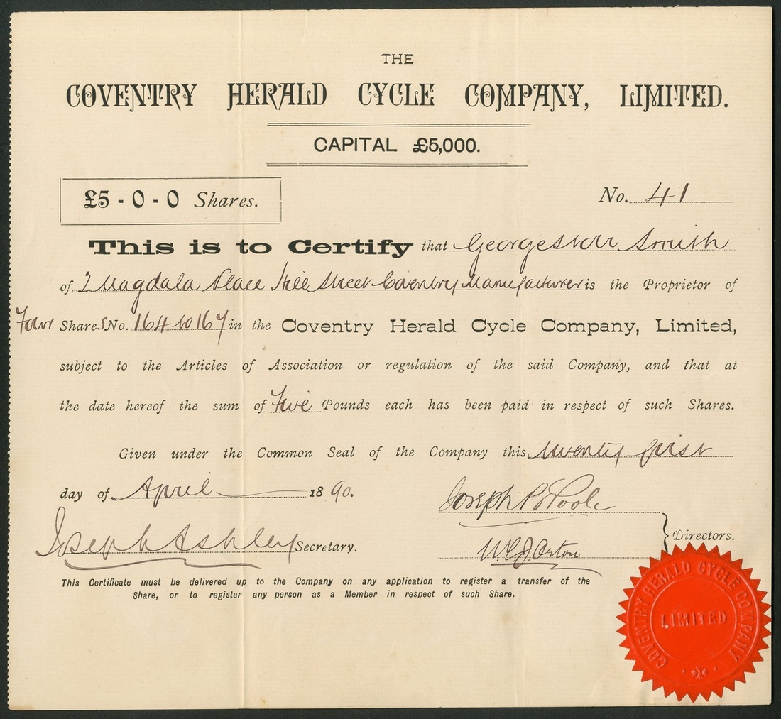 Great Britain: Coventry Herald Cycle Company Ltd., £5 shares, 18[90], #41, black, red seal. An early cycle manufacturer, established in 1888. Wound up in 1891. Coventry was the centre of the bicycle industry. AEF.