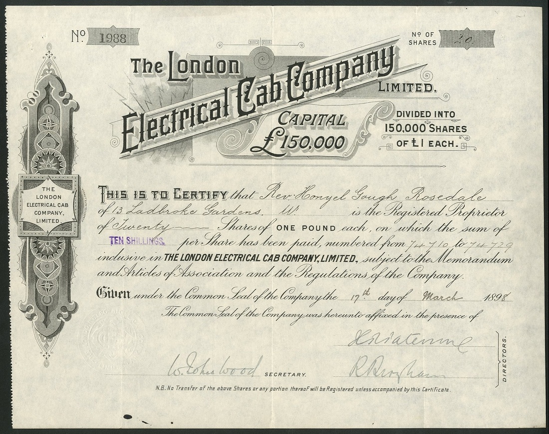 Great Britain: London Electrical Cab Co. Ltd., £1 shares, 189[7], #1988, black. Formed to acquire a licence from the British Motor Syndicate to work taxicabs in the London area. VF.
