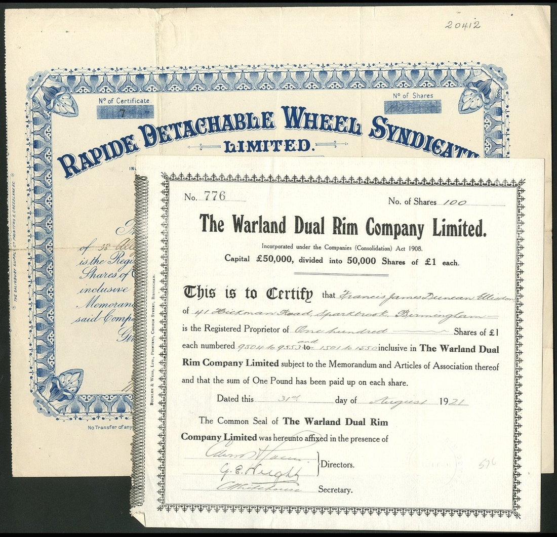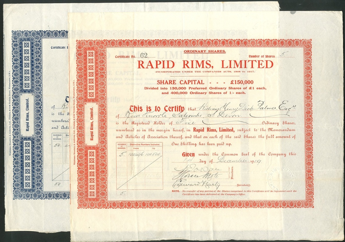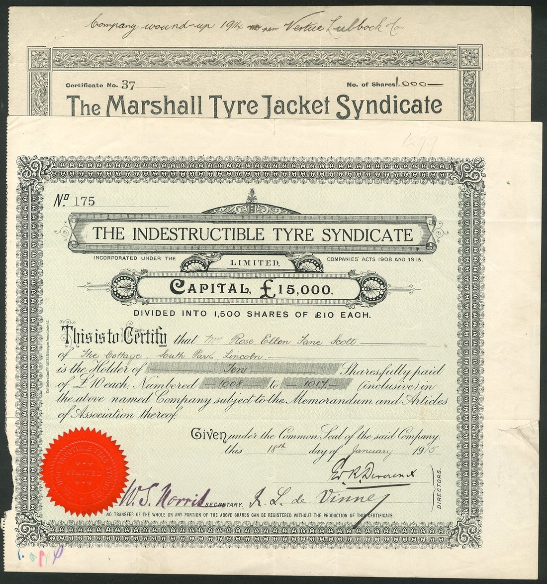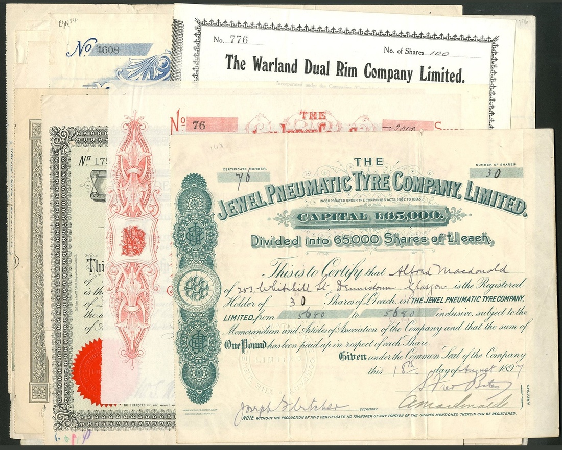 Great Britain: A small collection of tyre and wheel companies, comprising Amalgamated Pneumatic Tyre Companies Ltd., £1 shares, 189[8] and debenture stock, 18[98]; Atlas Non-Puncture Inner Case Syndicate Ltd., 5/- shares, 191[1], #76, red; Indestructible tyre Syndicate Ltd., £10 shares, 19[15], #175; Jewel Pneumatic Tyre Co. Ltd., £1 shares, 189[7], #76, printed by Waterlow; Marshall Tyre Jacket Syndicate Ltd., £1 shares, 191[1], #37; New Amalgamated Tyre Co. Ltd., 2/6d shares, 19[00], #4241, green and debenture stock, 190[0], #1189, black; Rapid Rims Ltd., 1/- ordinary shares, red and £1 preferred ordinary shares, blue, both 19[19]; Rapide Detachable Wheel Syndicate Ltd., £1 shares, 19[12], #7, blue, and, Warland Dual Rim Co. Ltd., £1 shares, 19[21], #776. Mixed condition but many VF, see scans for details (12).