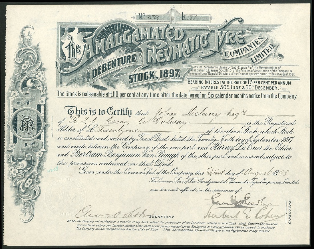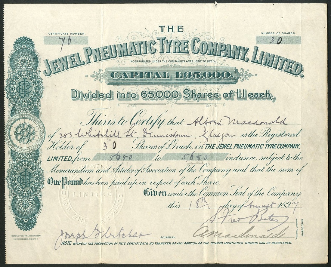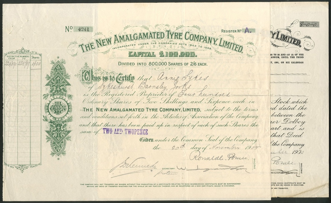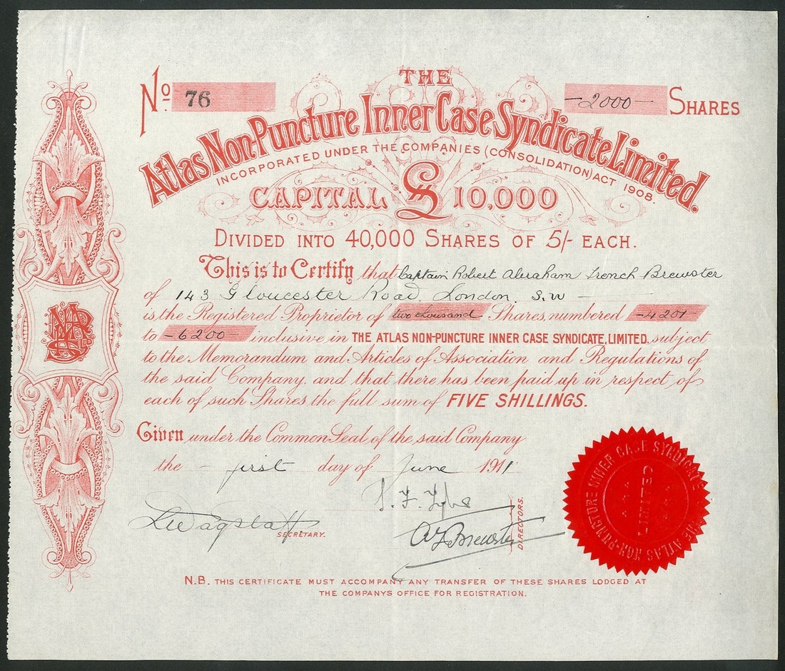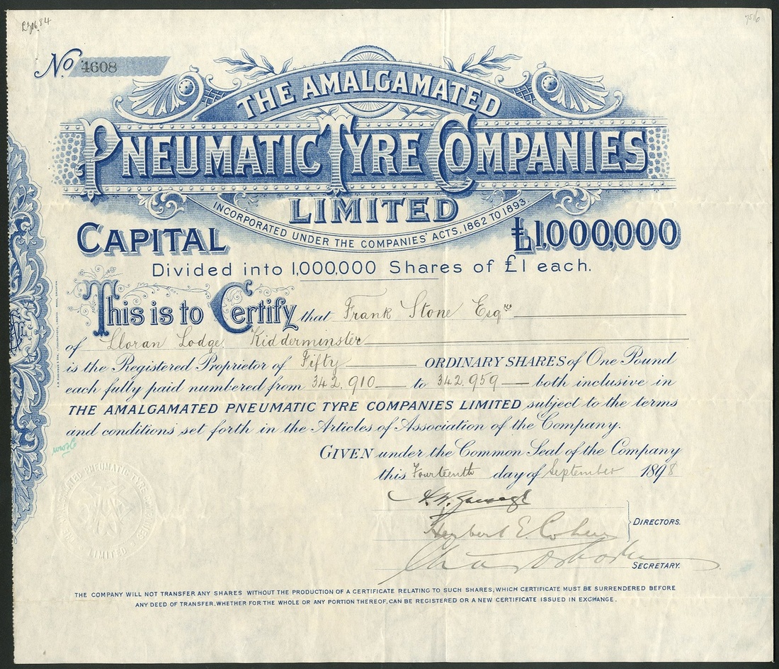Great Britain: A small collection of tyre and wheel companies, comprising Amalgamated Pneumatic Tyre Companies Ltd., £1 shares, 189[8] and debenture stock, 18[98]; Atlas Non-Puncture Inner Case Syndicate Ltd., 5/- shares, 191[1], #76, red; Indestructible tyre Syndicate Ltd., £10 shares, 19[15], #175; Jewel Pneumatic Tyre Co. Ltd., £1 shares, 189[7], #76, printed by Waterlow; Marshall Tyre Jacket Syndicate Ltd., £1 shares, 191[1], #37; New Amalgamated Tyre Co. Ltd., 2/6d shares, 19[00], #4241, green and debenture stock, 190[0], #1189, black; Rapid Rims Ltd., 1/- ordinary shares, red and £1 preferred ordinary shares, blue, both 19[19]; Rapide Detachable Wheel Syndicate Ltd., £1 shares, 19[12], #7, blue, and, Warland Dual Rim Co. Ltd., £1 shares, 19[21], #776. Mixed condition but many VF, see scans for details (12).