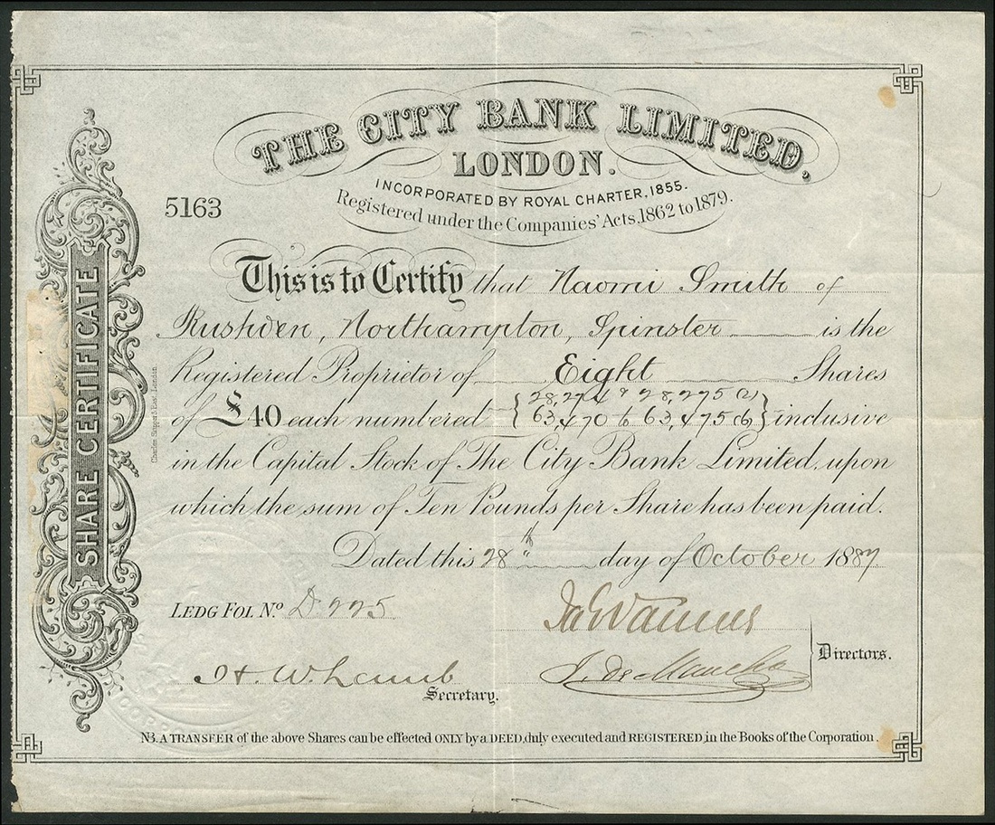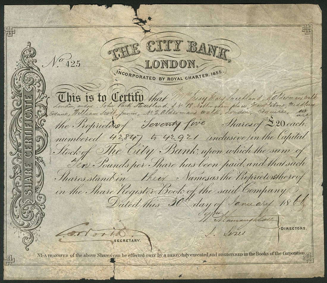 Great Britain: City Bank, London, £20 shares, 18[66], #425, scrollwork left, black. Together with City Bank Limited, £40 shares, 18[87], #5163, similar design. Incorporated by Royal Charter in 1855, became Limited in the 1880's and acquired by London & Midland Bank in 1898 to become London City and Midland Bank. The first with some edge damage and somewhat toned, the second VF (2).