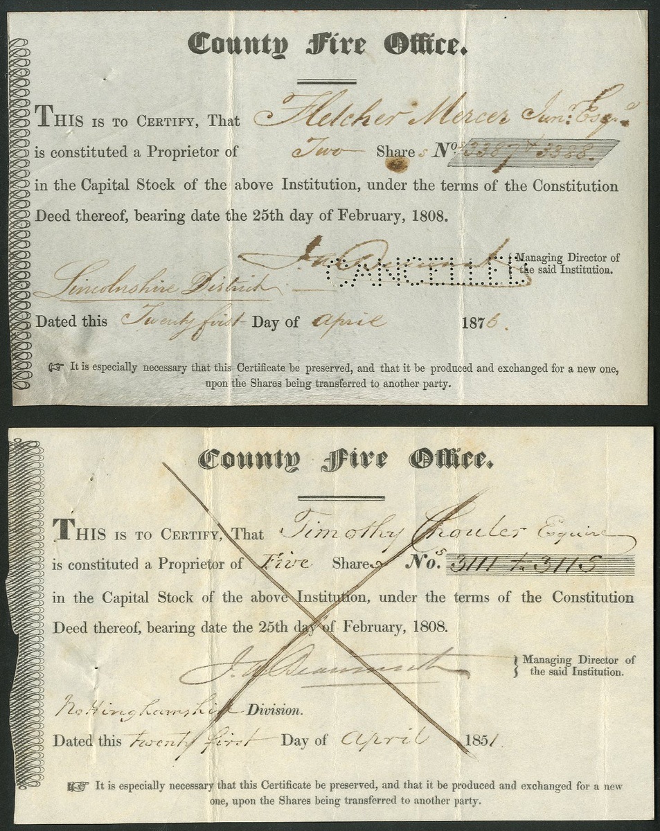 Great Britain: County Fire Office, a pair of certificates for shares, 185[1], #3111-3115 and 187[6], #3387-3388, both small format, printed in black, on vellum, both cancelled. The company was formed in 1808 with J Barber Beaumont as managing director. Both of these are signed by his son John Augustus Barber Beaumont who took over on his fathers death in 1841. Acquired by Alliance Assurance Company in 1906 but kept the trading name. VF (2).