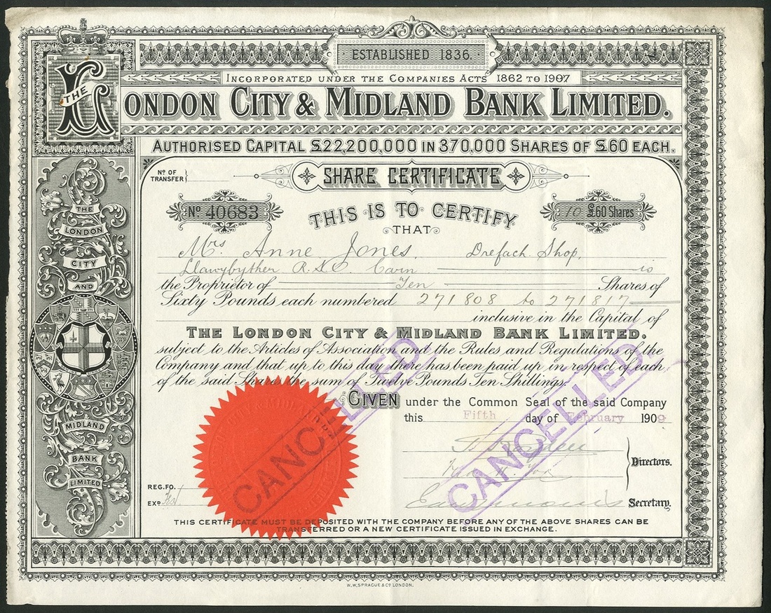 Great Britain; London City & Midland Bank Limited, £60 shares, 190[9], #40683, ornate border with scrollwork at left with arms of constituent banks, black, red seal, stamped cancelled. Following several acquisitions title changed to just Midland Bank Limited in 1923. VF.