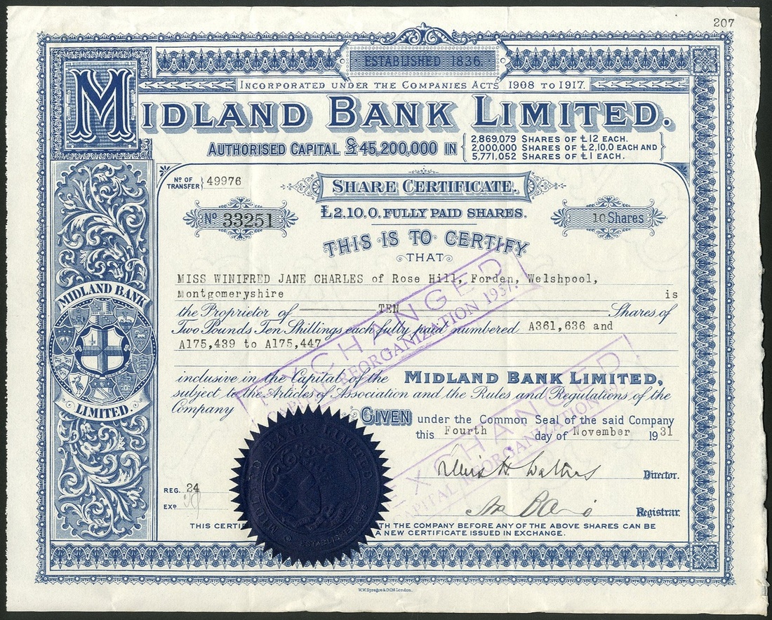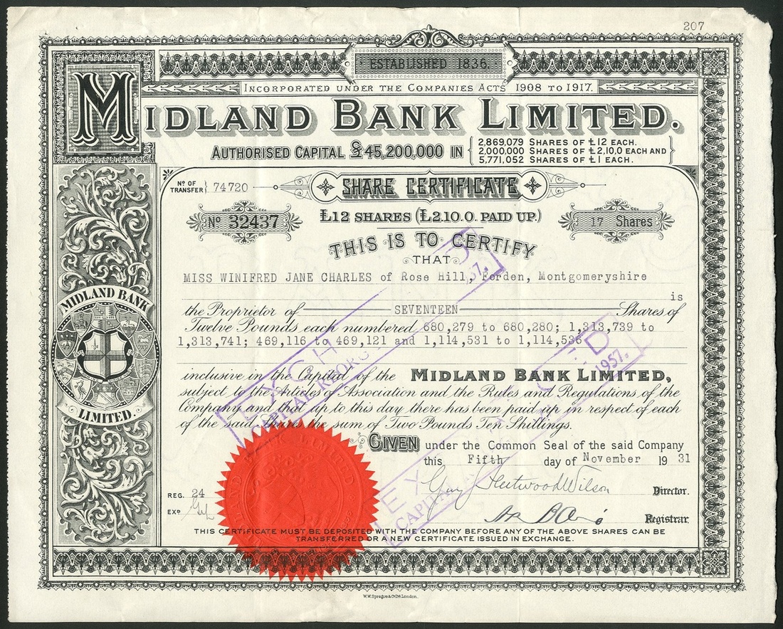 Great Britain: Midland Bank Limited, pair of certificates for £2 10 shilling shares, #33251, blue and £12 shares, #32437, black, both dated 19[31] issued to the same shareholder, scrollwork left with arms of constituent banks, stamped cancelled. The latter with tip of top right corner missing, VF (2).