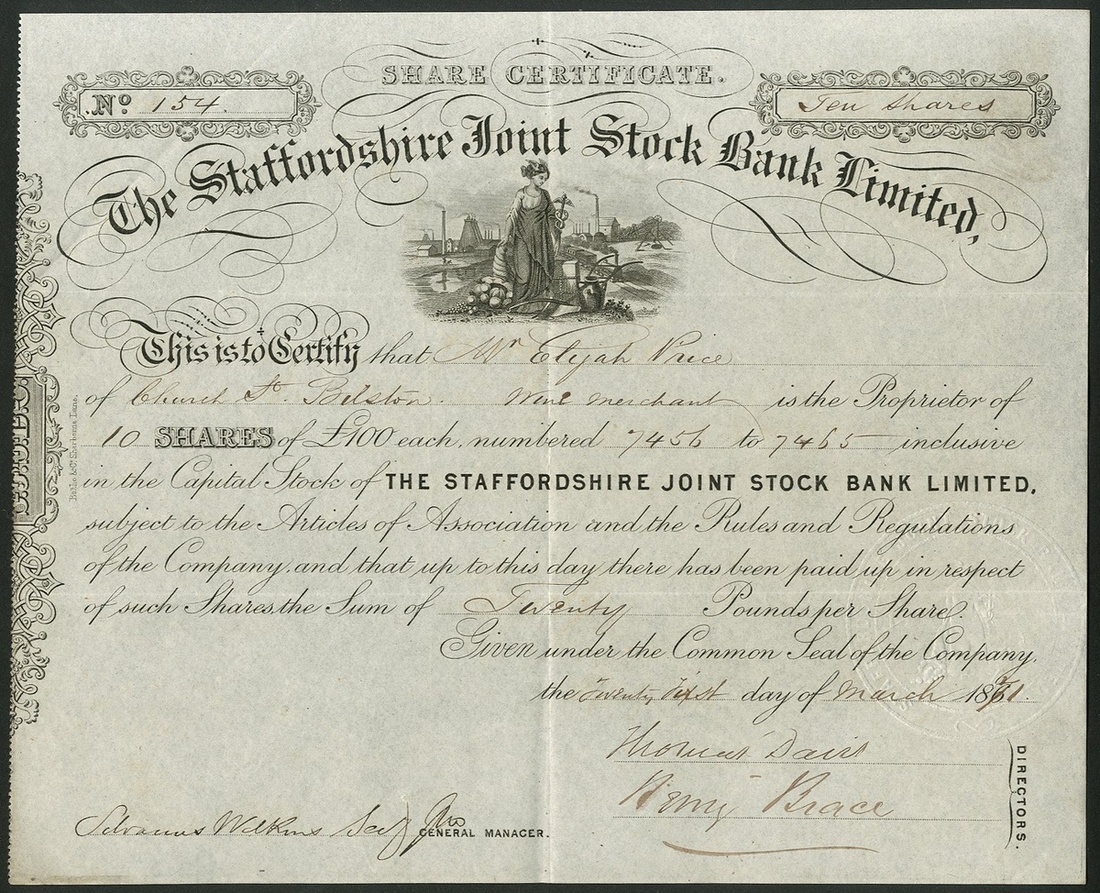 Great Britain: Staffordshire Joint Stock Bank Limited, £100 shares, 186[71], #154, allegorical female and industrial scanes, black. Acquired by the Metropolitan and Birmingham Bank in 1889, eventually becoming part of the Midland Bank group. VF.