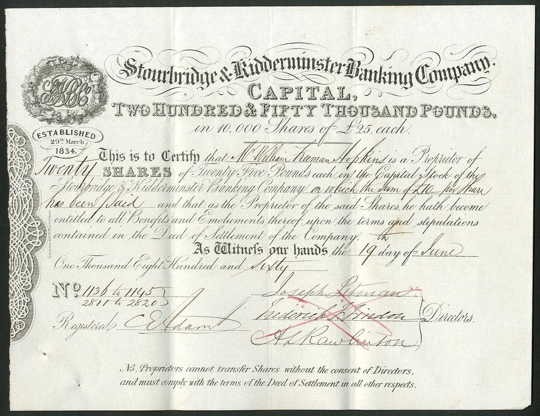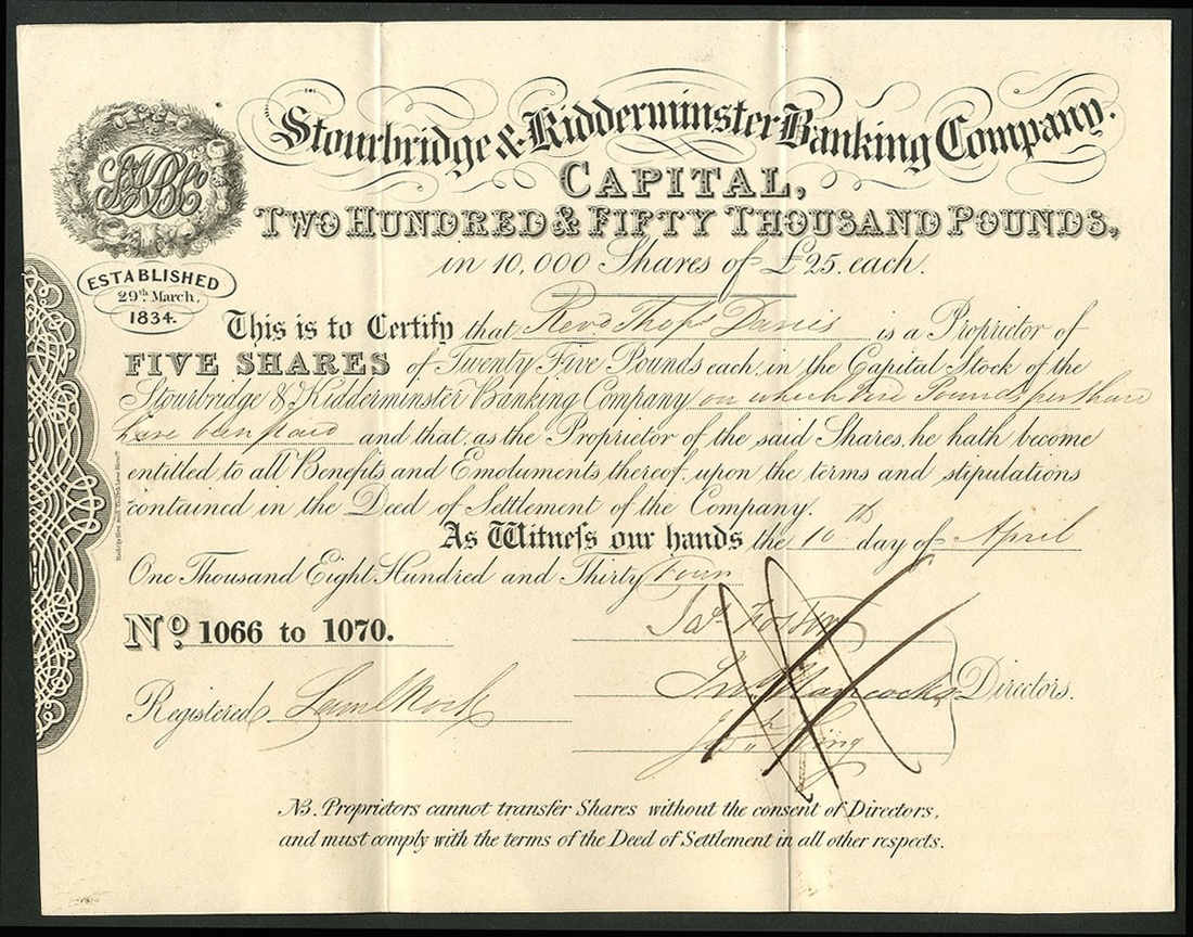 Great Britain: Stourbridge & Kidderminster Banking Company, a pair of certificates for 5 shares of £25, 183[4], #1066-1070 and various £25 shares, 18[60], company logo at top left, black cream paper on the first, greyish on the second, ink cancelled through signatures. Established in 1834 by ironmaster James Foster, who signs the first piece. Acquired by Birmingham Banking Company in 1880. GVF (2).