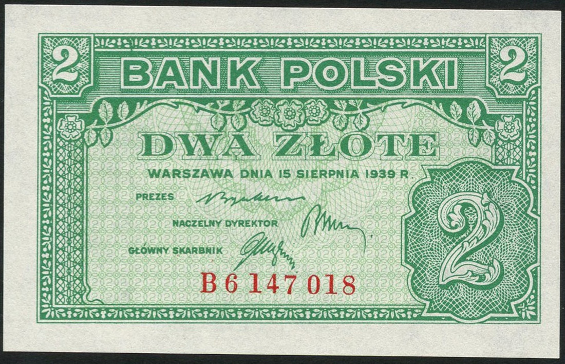 Bank Polski, Government in Exile, 2 zlote, 1939, red serial number B 6147018, green, value at top left and right and low right,