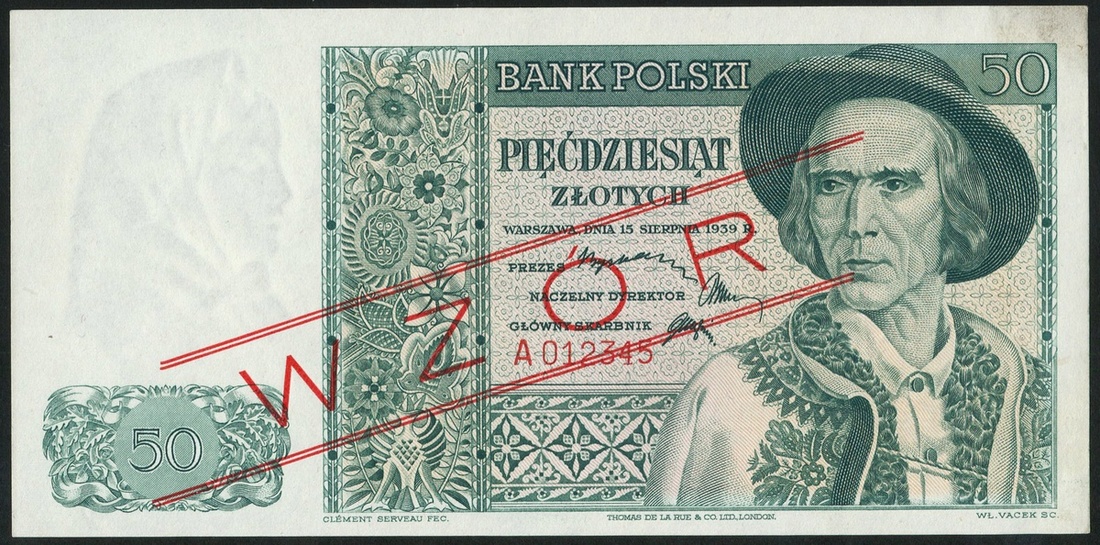 Bank Polski, Government in Exile, specimen 50 zlotych, 1939, red serial number A 012345, green, man in national dress at right, value at low left and at top right, reverse green, trees and mountains,