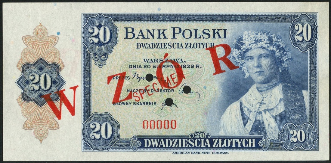 Bank Polski, Government in Exile, specimen 20 zlotych, 1939, red serial number 0000000, blue and pale green, girl in national dress wearing oak wreath at right, value at each corner and on counterfoil at left, reverse blue, church at centre,