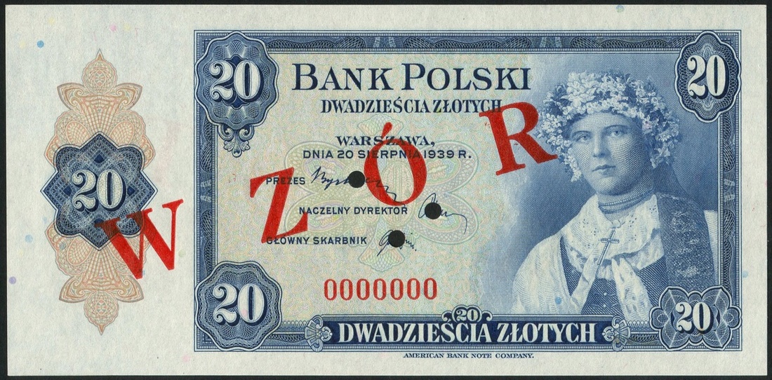 Bank Polski, Government in Exile, specimen 20 zlotych, 1939, red serial number 00000, blue and pale green, girl in national dress wearing oak wreath at right, value at each corner and on counterfoil at left, reverse blue, church at centre,