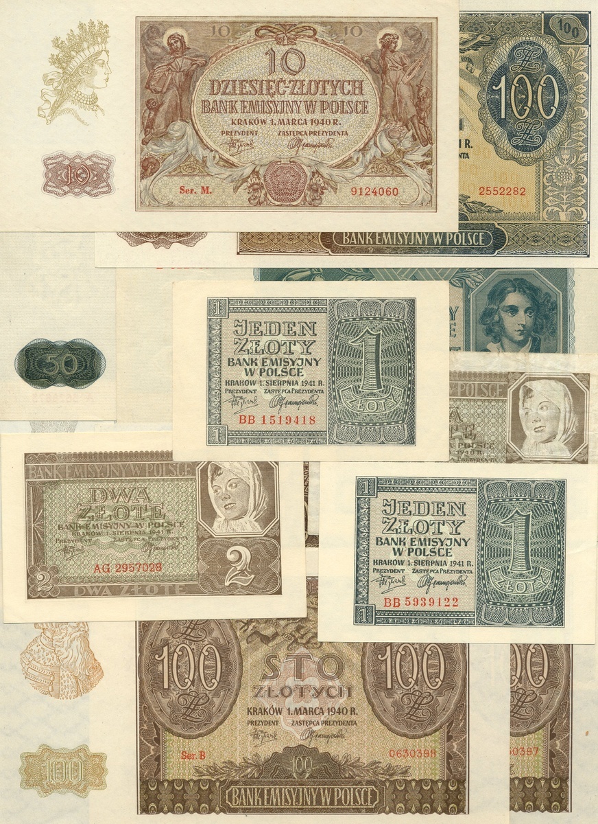 Emission Bank of Poland, 1, 2 (2), 5, 10 (2), 20, 50, 100 (3) and 500 zlotych, 1940, together with 1 (2), 2 (2), 5 (2), 50 (2) and 100 (2) zlotych, 1941,