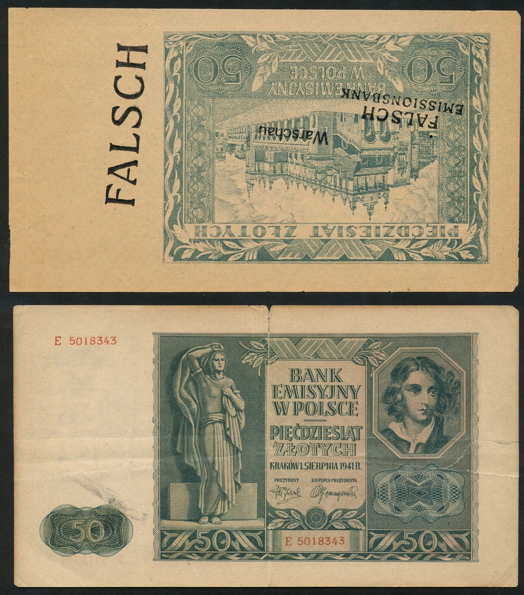 Emission Bank, Krakow, Resistance overprints, 50 zlotych, 1941 (August 1944), blue with handstamp 'A.K. Regula Pierwszy zold powstanczy SIERPIEN 1944 R', also a forgery handstamped 'FALSCH EMISSIONSBANK'