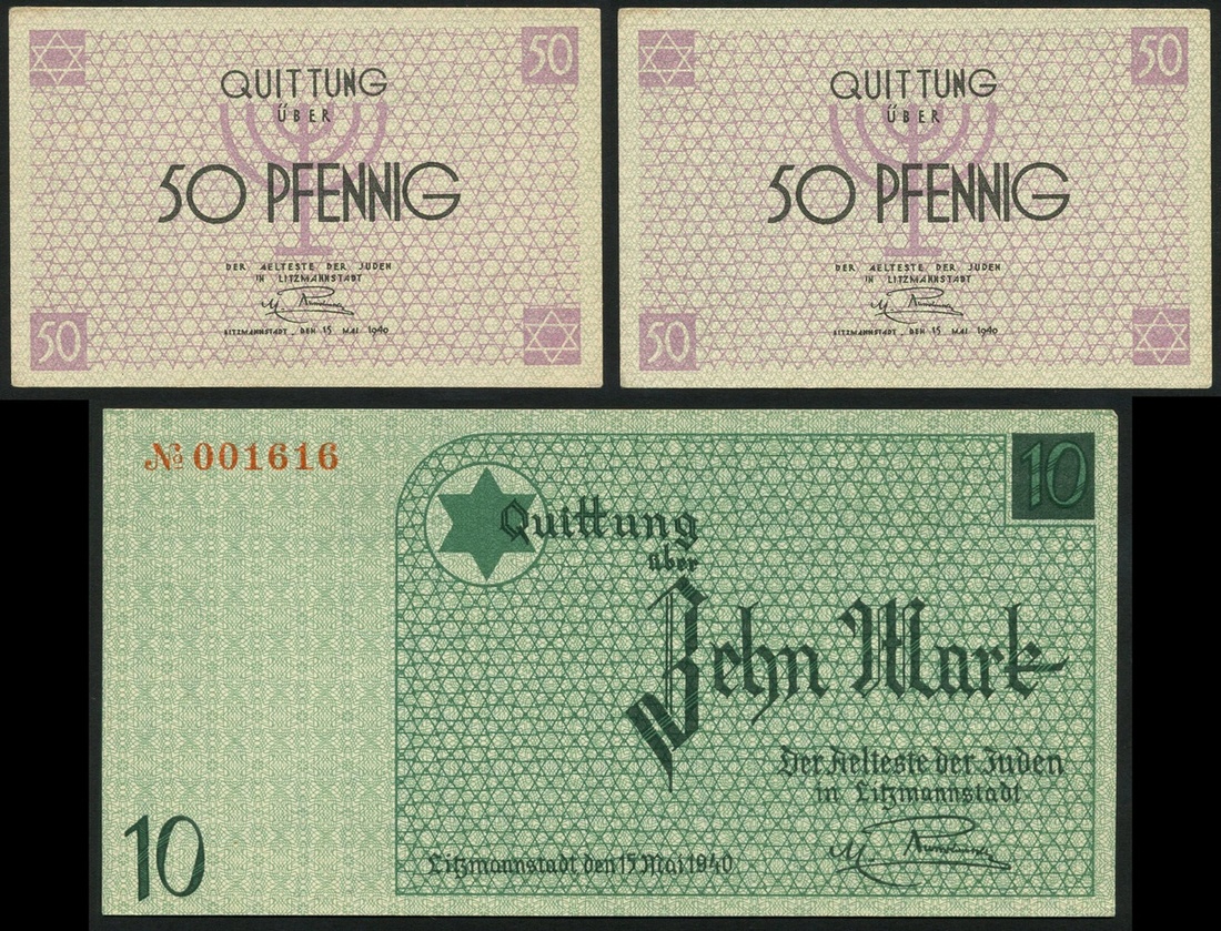Lodz/Litzmannstadt Ghetto notes, 50 fenigow (2) consecutive pair, 10 mark, 15 May 1940, (Campbell 4200, 4204), generally good extremely fine (3)