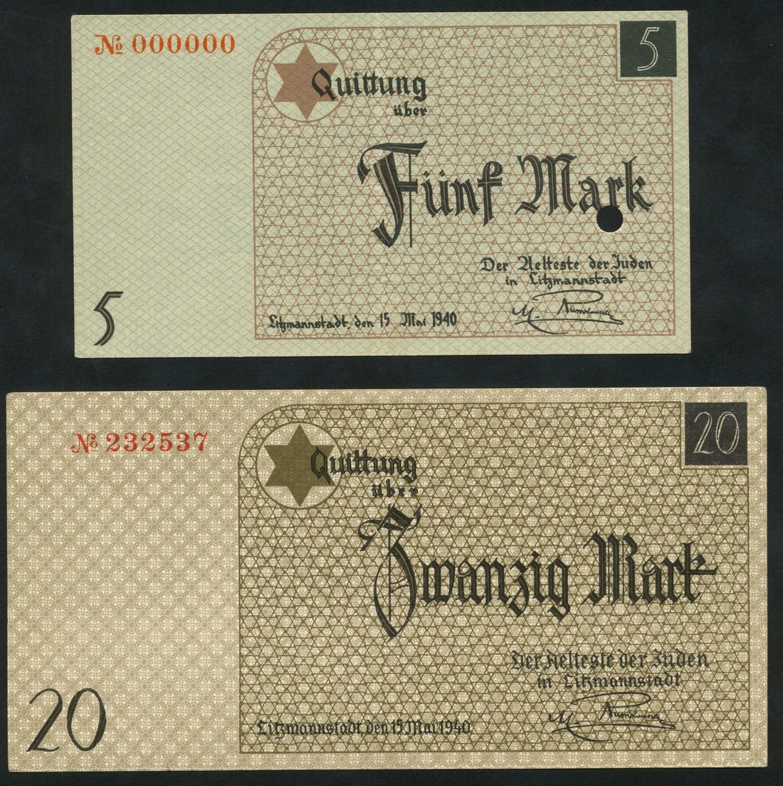 Lodz/Litzmannstadt Ghetto notes, specimen 5 mark, red serial number 000000, and 20 mark, 15 May 1940, (Campbell 4202s, 4205a), good extremely fine, the specimen with small perforation in right field, rare (2)