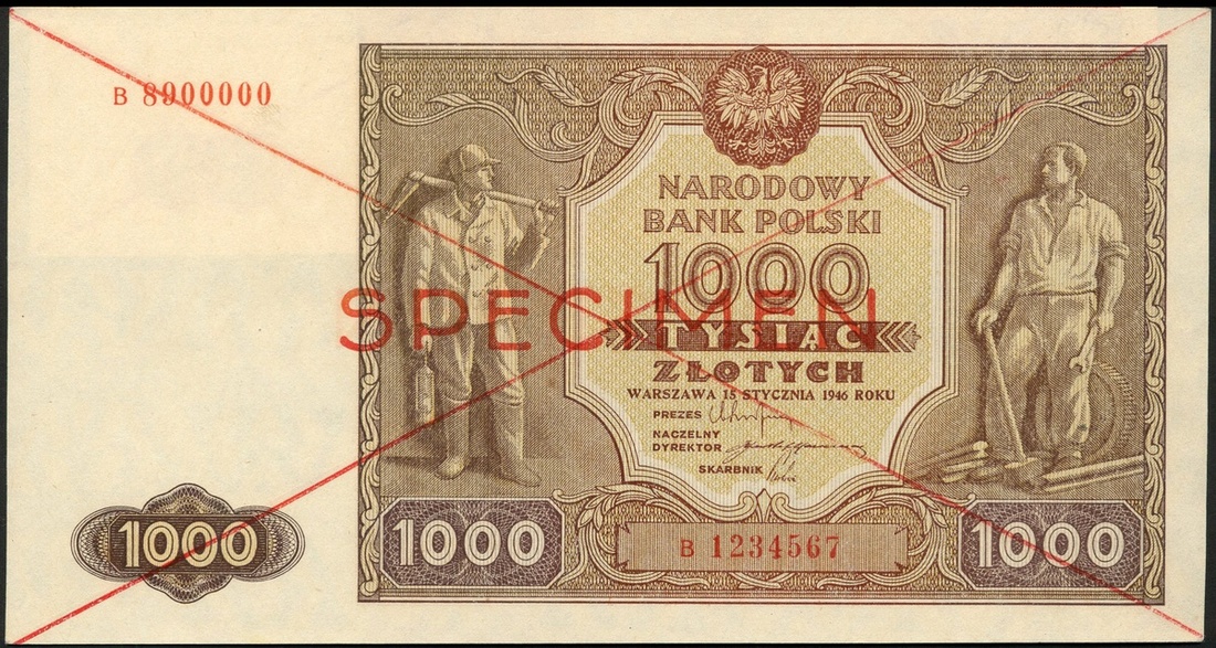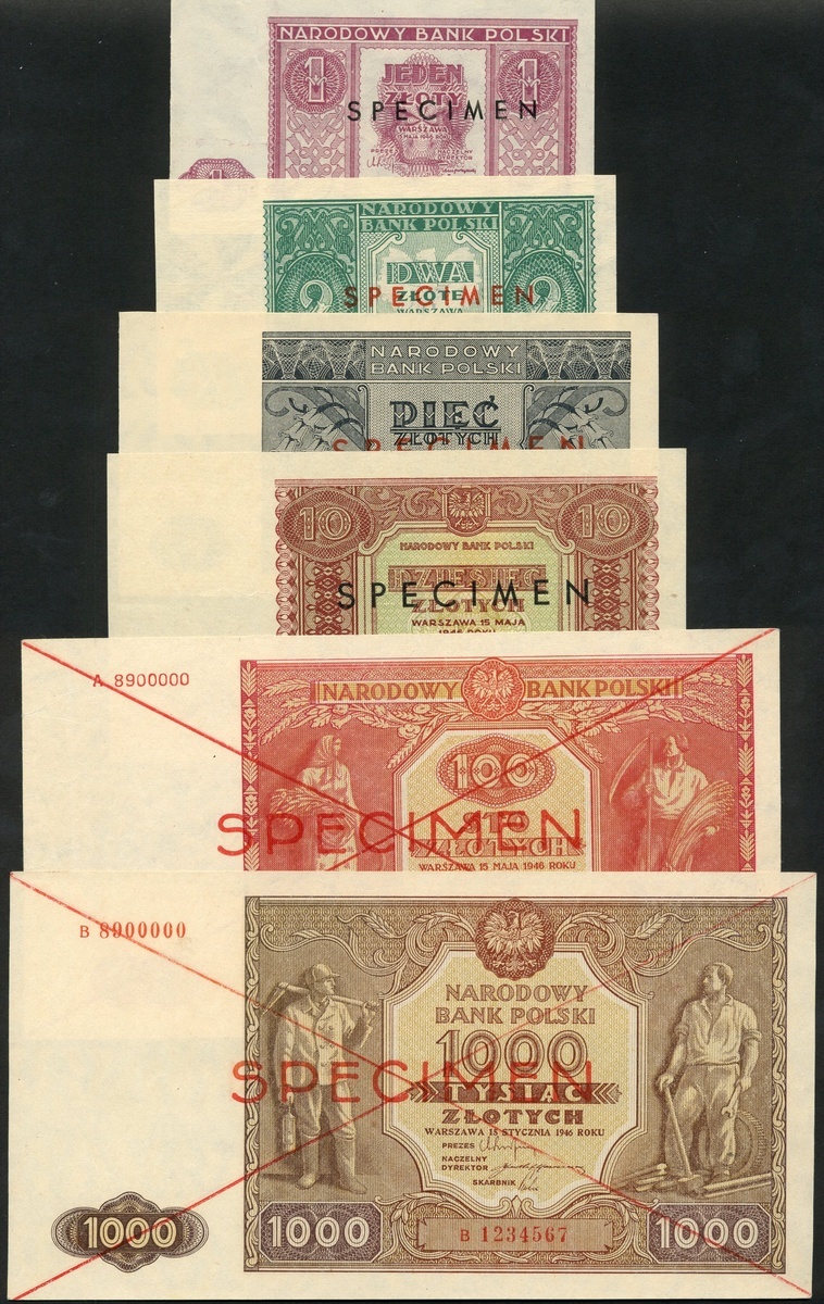 Narodowy Bank Polski, Polish National Bank, specimen 1000 zlotych, 15 January 1946, specimen 1, 2, 5, 10 and 100 zlotych, 15 May 1946,