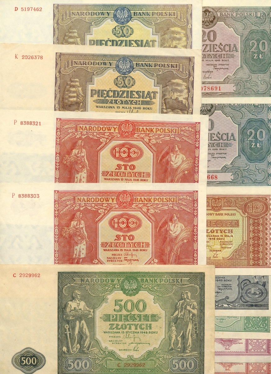 Narodowy Bank Polski, Polish National Bank, a selection comprising 500 zlotych, 1946 first issue, also second issue 1 zlote (2), 2, 5, 10, 20 (2), 50 (2) and 100 (2) zlotych, all 1946 second issue,
