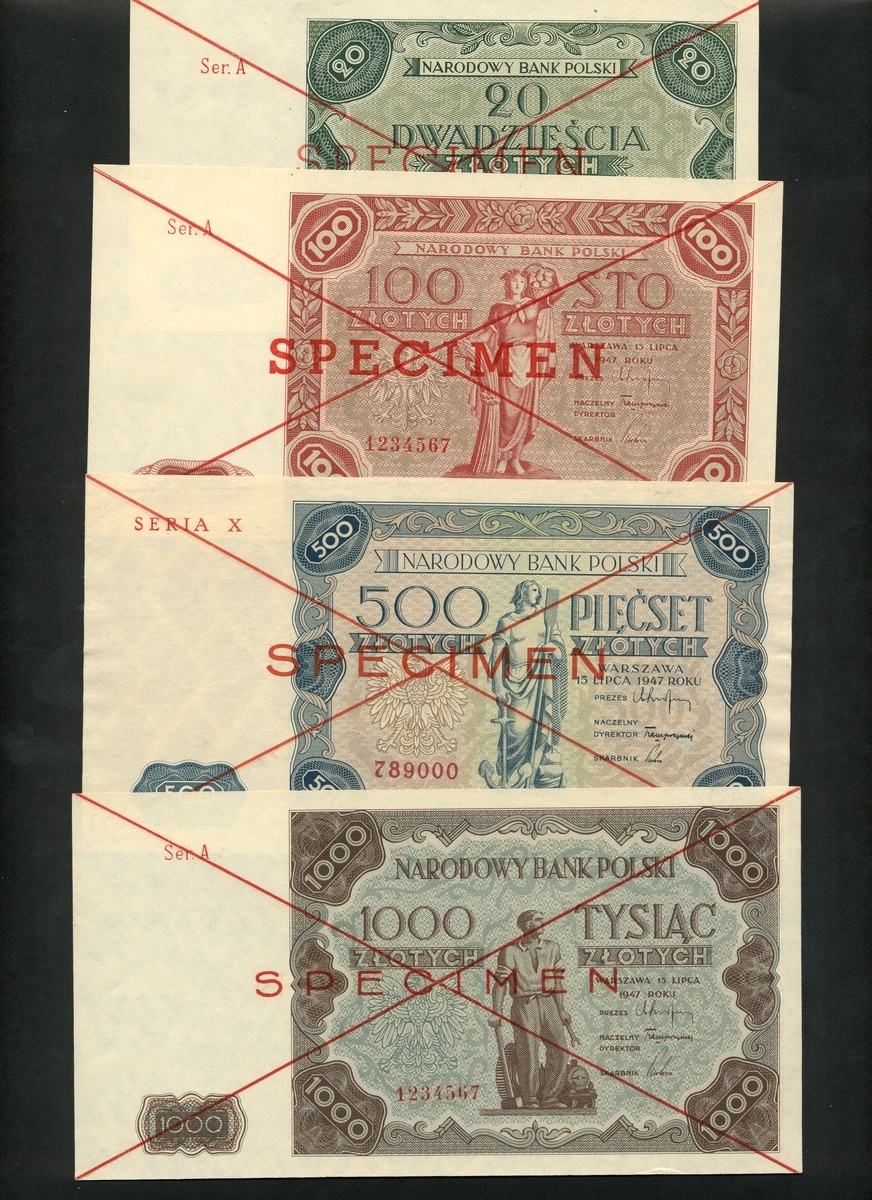 Narodowy Bank Polski, Polish National Bank, Peoples Democratic Republic, specimen 20, 100, 500 and 1000 zlotych, 1947, green, brown, blue and purple respectively,