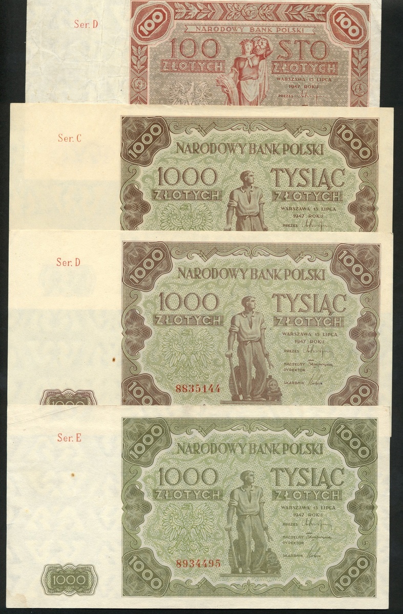 Narodowy Bank Polski, Polish National Bank, Peoples Democratic Republic, 100, 1000 (3) zlotych, 1947, red-brown, the 1000 one green and two shades of purple and green