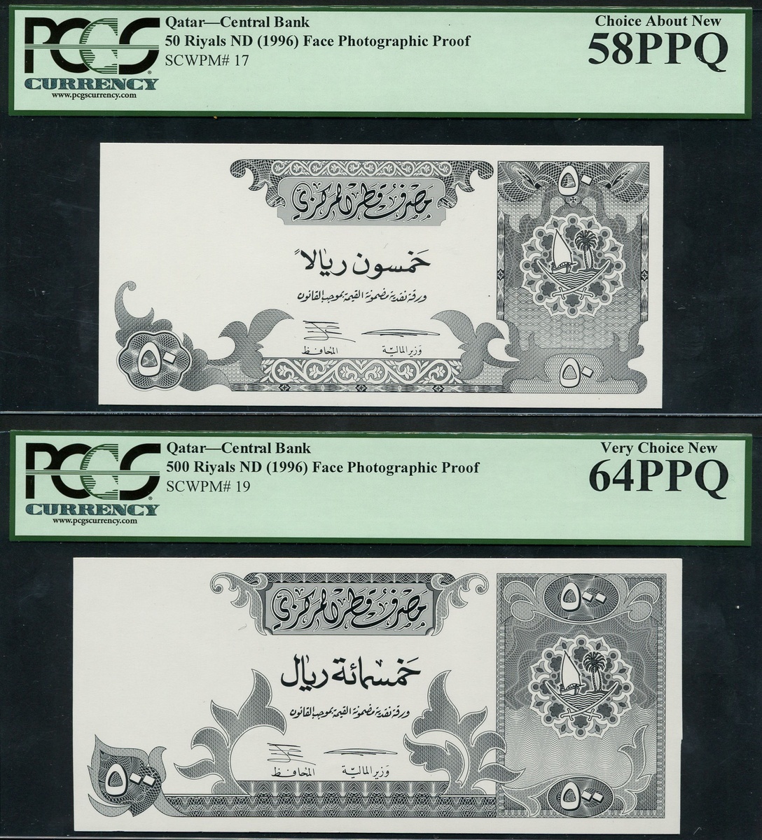 Central Bank of Qatar, two obverse photographic proofs for a 50 riyals, ND (1996), black and white, also 500 riyals, ND (1996), black and white, both arms at right, value low left and top left and right