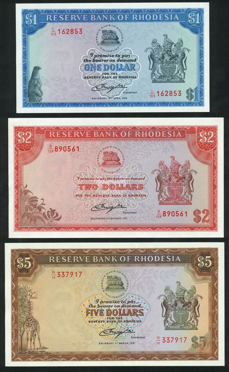Reserve Bank of Rhodesia, $1, 1978, blue, $2, 1977, red and $5, 1976, brown, all arms at right,