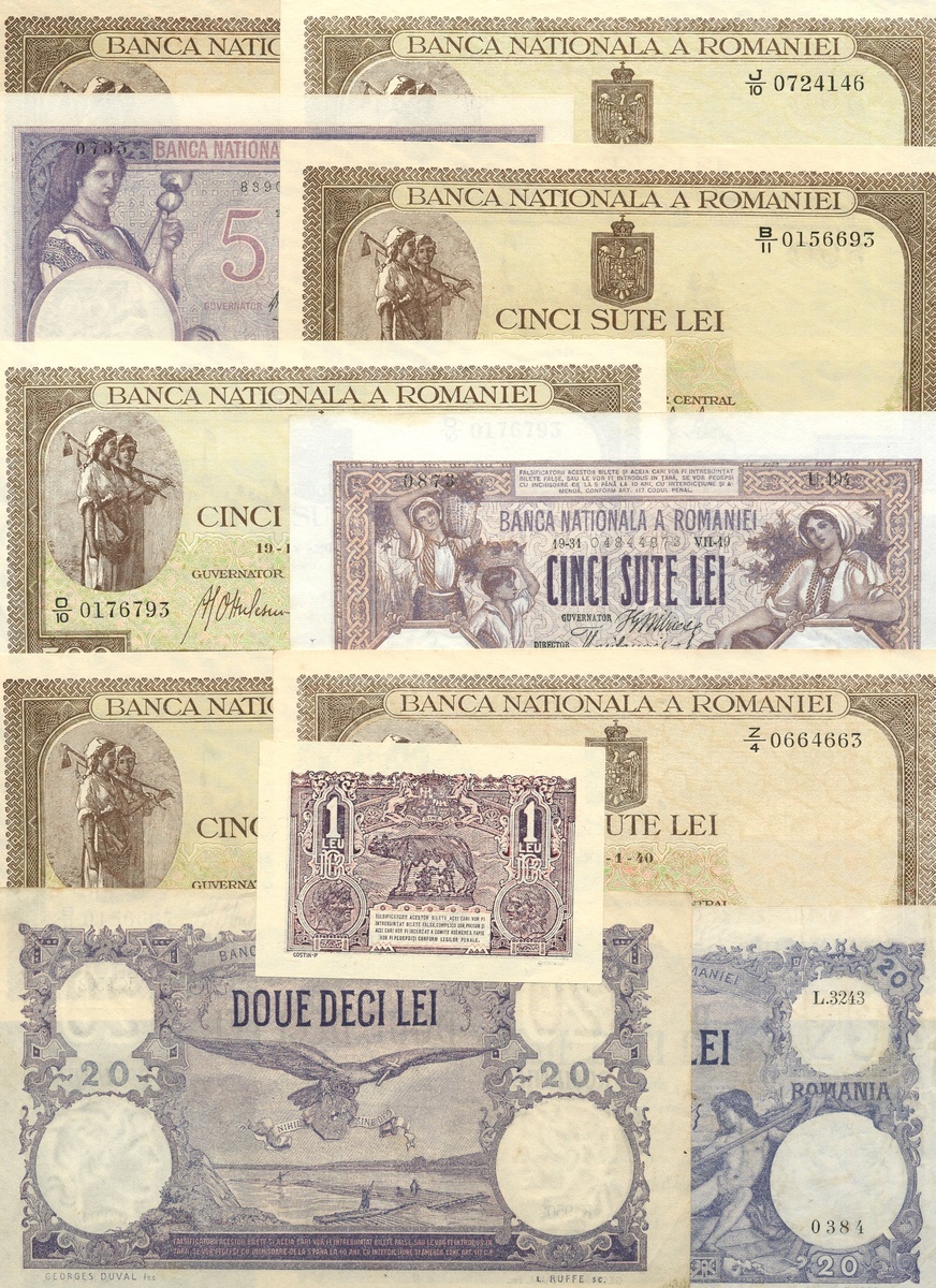 (x) National Bank of Romania, 500 Lei 1916-1920, serial number U.194 0873, violet-blue, woman with boy at left, farmers wife at right, 500 (9) Lei, 1940-1943, brown on multicolour underprint, 20 (3) Lei, 25 March 1920 ,31 January 1929, 19 September 1929, blue-violet, girl with fruit at left, 5 Lei, 22 November 1928, serial number C.3357 0735, violet, farmers wife at left, 1 Leu, 21 December 1938, serial number L.1219 0331