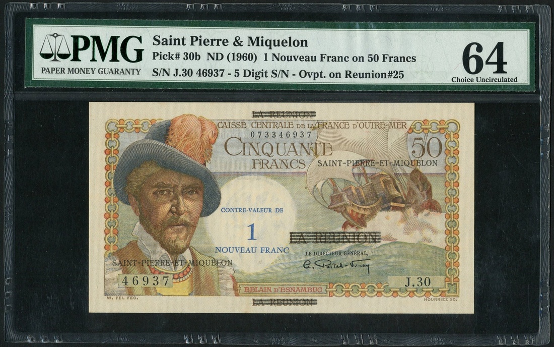(x) Saint Pierre & Miquelon, 1 nouveau franc on 50 francs, ND (1960), serial number J.30 46937, brown, green, blue, orange, yellow, and red, trader Pierre Belain d’Esnambuc wearing hat with feather at left, sailing ship at left, reverse, native woman of Togo holding at left