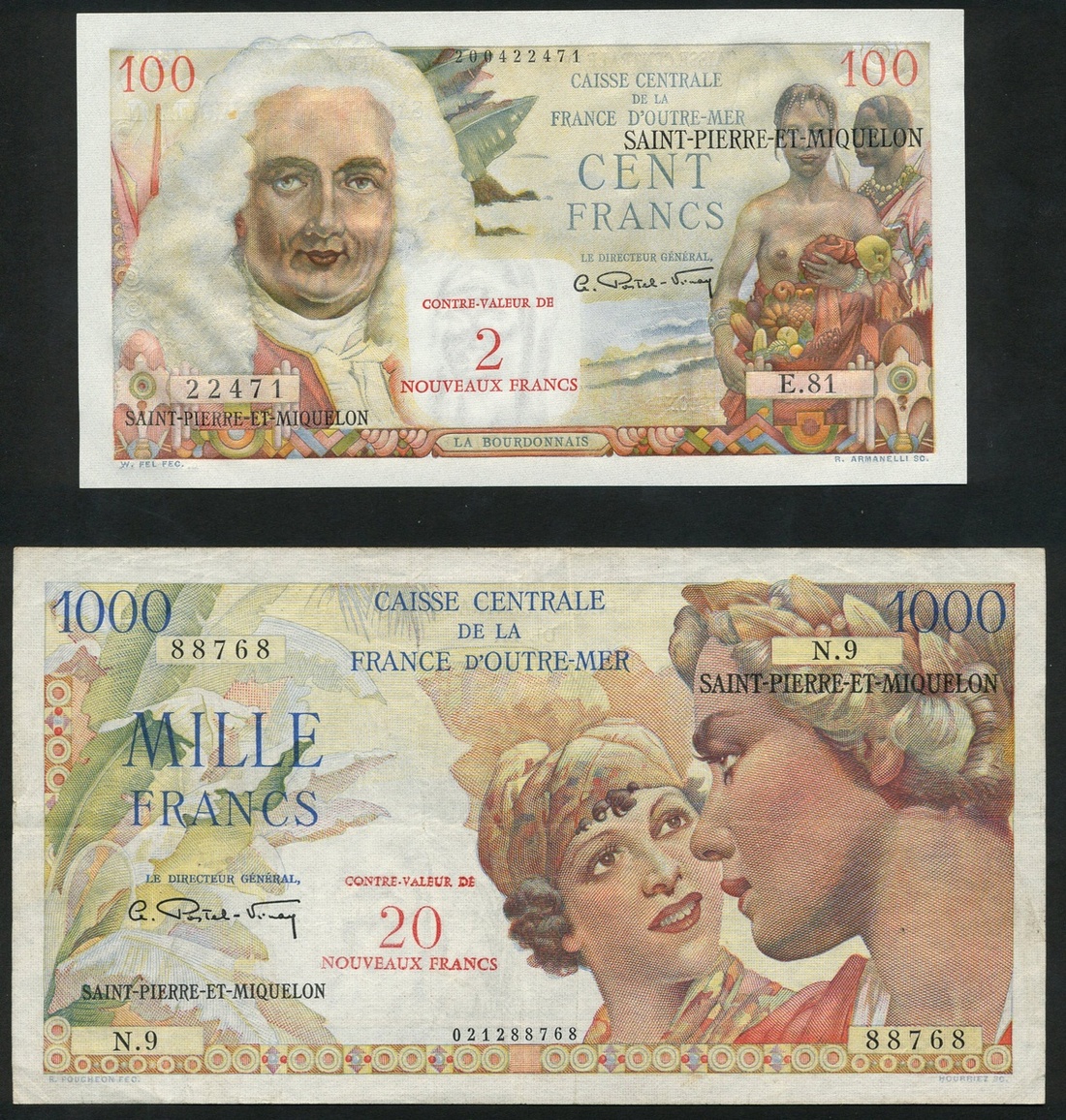 Caisse Centrale de la France d'Outre-Mer, Saint Pierre-et-Miquelon, 2 nouveaux francs on 100 francs, ND (1963), serial number E.81 22471, multicolour, La Bourdonnais at left, reverse woman at left, mountain range in background, 20 nouveaux francs on 1000 francs, ND (1964), serial number N.9 88768, multicolour, two women at right, reverse, men in boat,