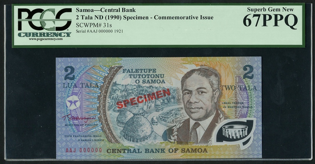 (x) Central Bank of Samoa, specimen 2 Tala, ND (1990), blue and multicolour, village with huts, Malietoa Tanumafili II at right, reverse, family gathering scene,