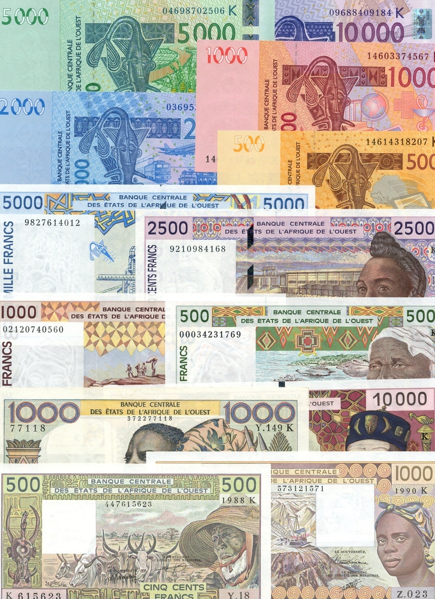 (x) Banque Centrale des Etats de l'Afrique de l'Ouest, Senegal, 1000 francs, ND (1977), multicoloured, man and woman at right, 500 francs (2), 1000 francs, 1991, 500 (2), 1000 (7), 2500, 5000 and 10000 francs and later issues including 10000 francs (2)