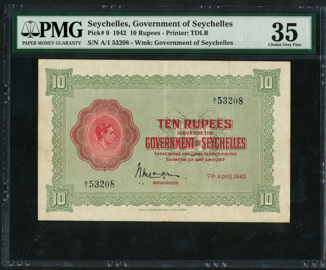 (x) Government of Seychelles, 10 rupees, 7 April 1942, serial number A/1 53208, red on green underprint, George VI at left, signature William Marston Logan, uniface