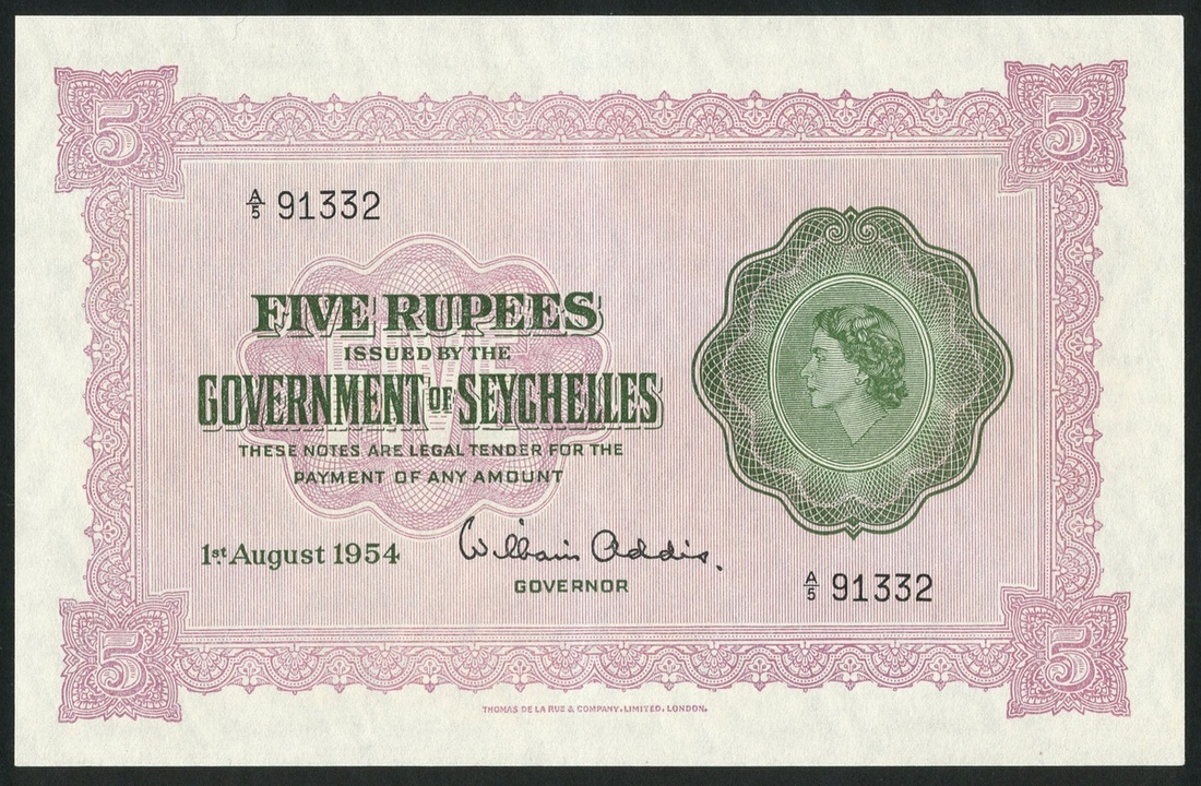 (x) Government of Seychelles, 5 rupees, 1 August 1954, serial number A/5 91332, lilac-pink, Elizabeth II in green oval vignette at left, William Addis signature low centre,