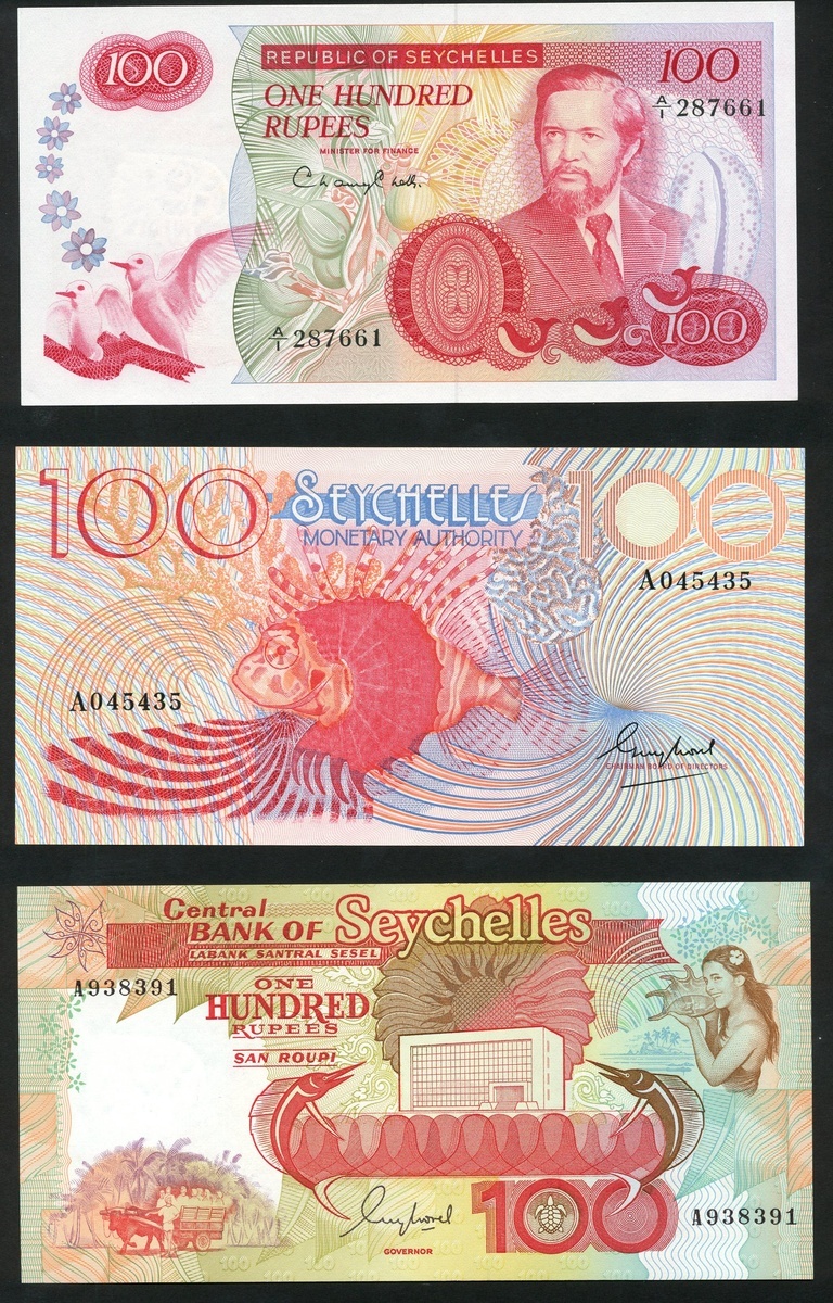 (x) Republic of Seychelles, 100 rupees, ND (1977), serial number A/1 287661, red and multicoloured, President Mancham at right, Chetty signature, also 100 rupees, ND (1979), serial number A 045435, red, fish at left, Morel signature, also 100 rupees, ND (1989), prefix A, red