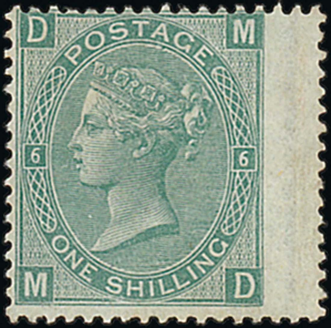 1/- green, Plate 6: MD with wing margin at right, part original gum (redistributed), fresh and fine. S.G. 117, £1,200. Photo