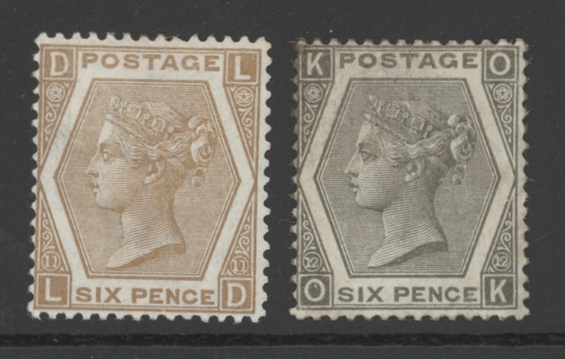 6d. chestnut, Plate 11: LD (reperforated wing margin), 6d. grey Plate 12: OK (regummed); fine appearance. S.G. 122a, 125