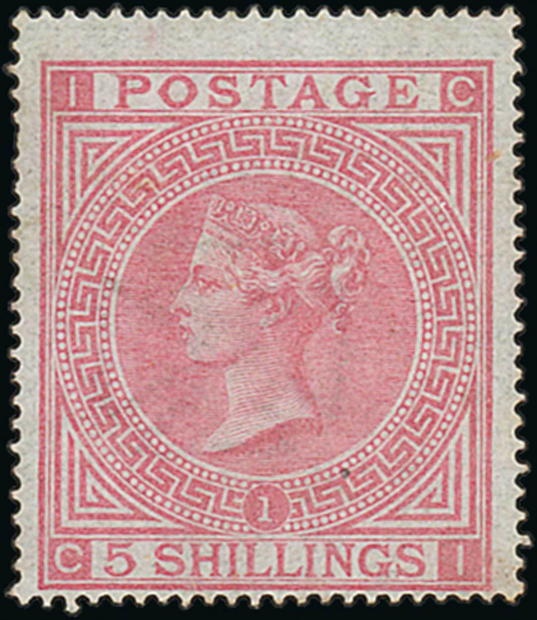 5/- pale rose, Plate 1 : CI, unused without gum, a couple of black specks on the front; fine and an attractive example. S.G. 127, £11,000. Photo