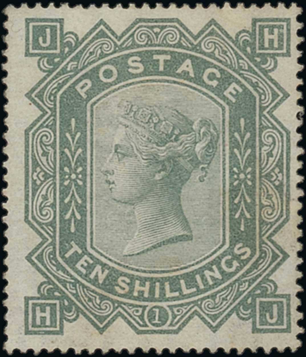 10/- greenish grey, HK, unused (regummed), quite well centred, good colour and perfs., repaired tear at right, nevertheless an attractive and fine appearing example of this very rare stamp. S.G. 128, £60,000. Photo