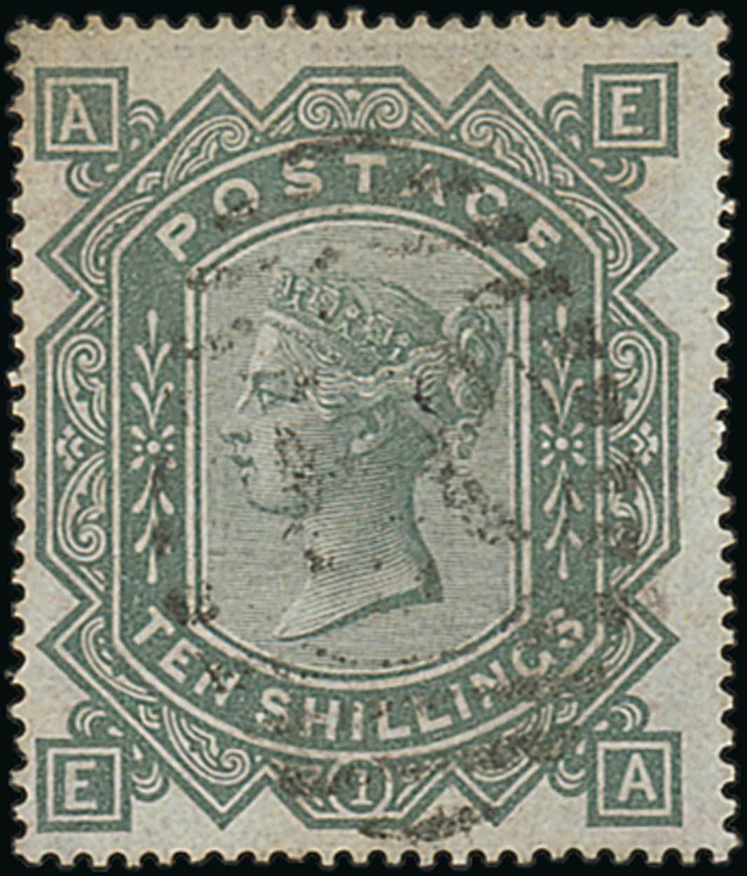 10/- greenish grey, EA, "R" in bars cancellation, good colour and perfs., centred a little to left; fine. S.G. 128, £3,200. Photo