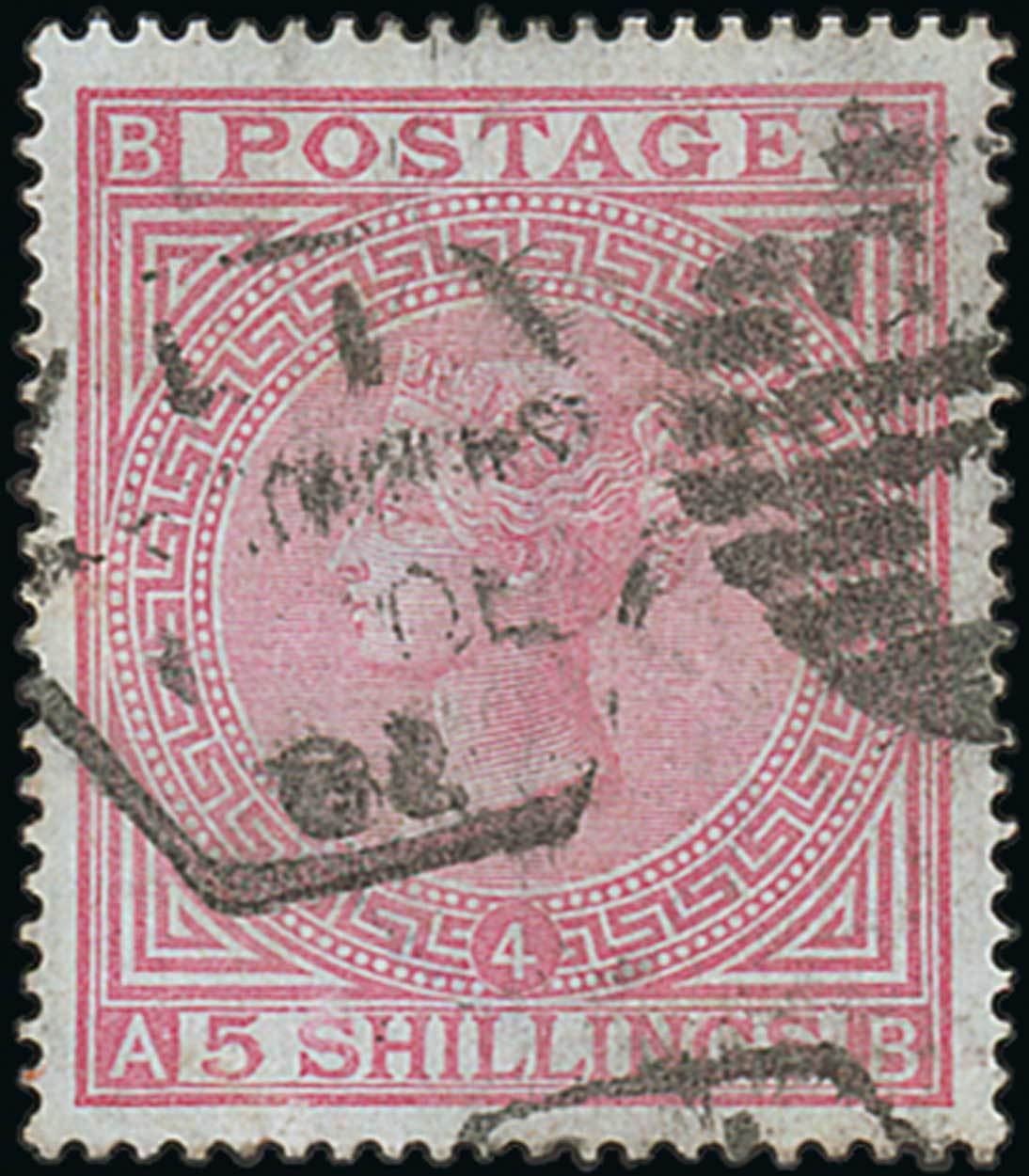 5/- rose, Plate 4: AB, London duplex cancellation, some creases and nibbed perf. at foot. S.G. 130, £4,800. Photo