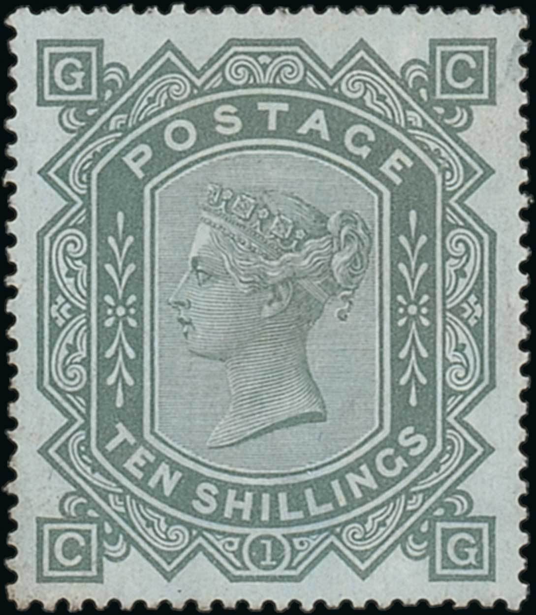 10/- grey-green, CG, unused without gum, light pressed crease in no way detracting from the excellent appearance of this well centred example with fresh colour. S.G. 131, £135,000. Photo