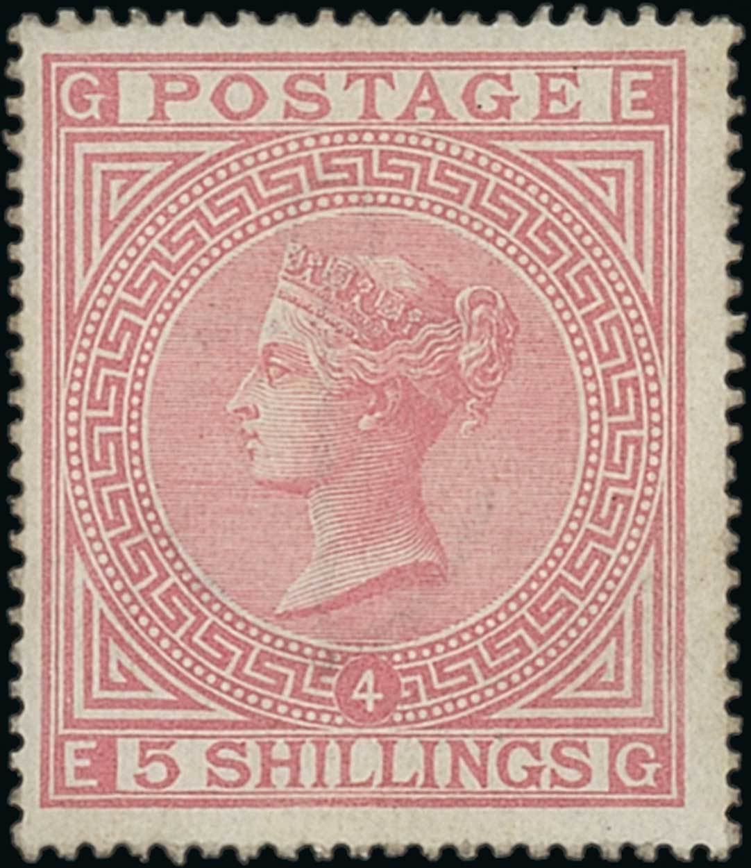 5/- rose, Plate 4: EG, unused (regummed), quite well centred, good colour, fine appearance and rare. S.G. 134, £35,000. Photo