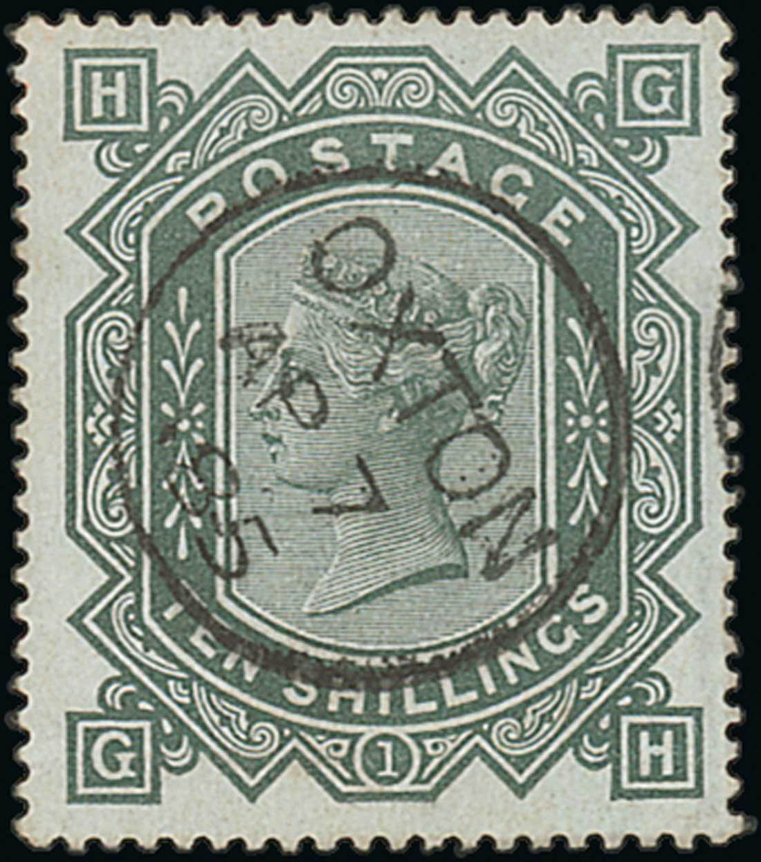 10/- greenish grey, GH, central Oxton c.d.s. of 7 April 1885, well centred, lovely colour and good perfs., a horizontal crease at foot hardly detracts. S.G. 135, £4,500. Photo