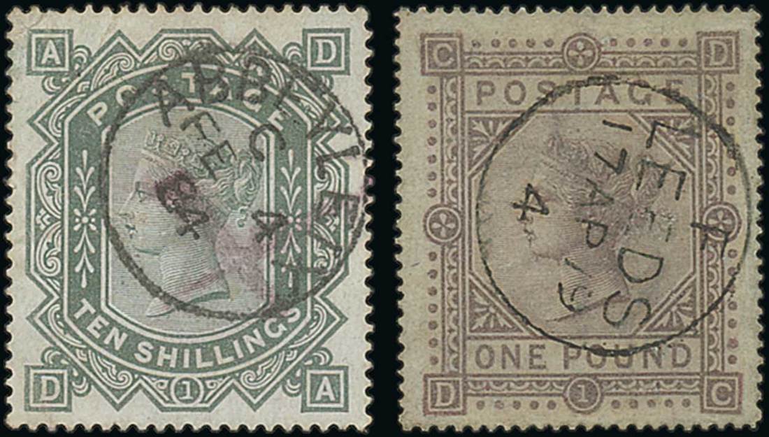 10/- greenish grey, DA and £1 brown-lilac DC, both with c.d.s.; faults but fair appearance. S.G. 135-136, £13,500. Photo