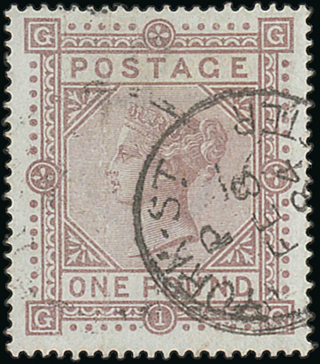 £1 brown-lilac, GG, York St. c.d.s. of 8 Feb. 1884, pressed vertical creases, good colour and fine appearance. S.G. 136, £9,000. Photo
