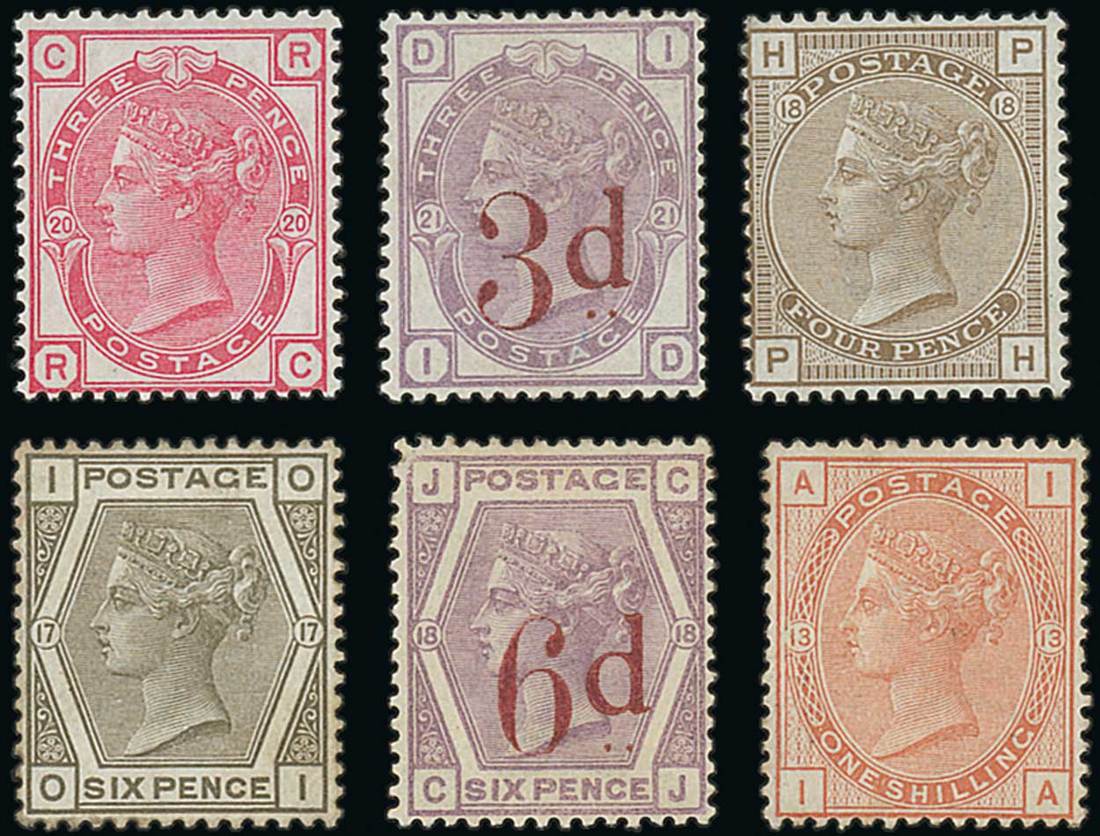 2½d. Plate 23, 3d. Plate 20, 3d. on 3d., 4d. Plate 18 (2, one with rounded corner), 6d. Plate 17, 6d. on 6d. 1/- Plate 13, part original gum, unused or regummed, chiefly good to fine. £4,925. Photo