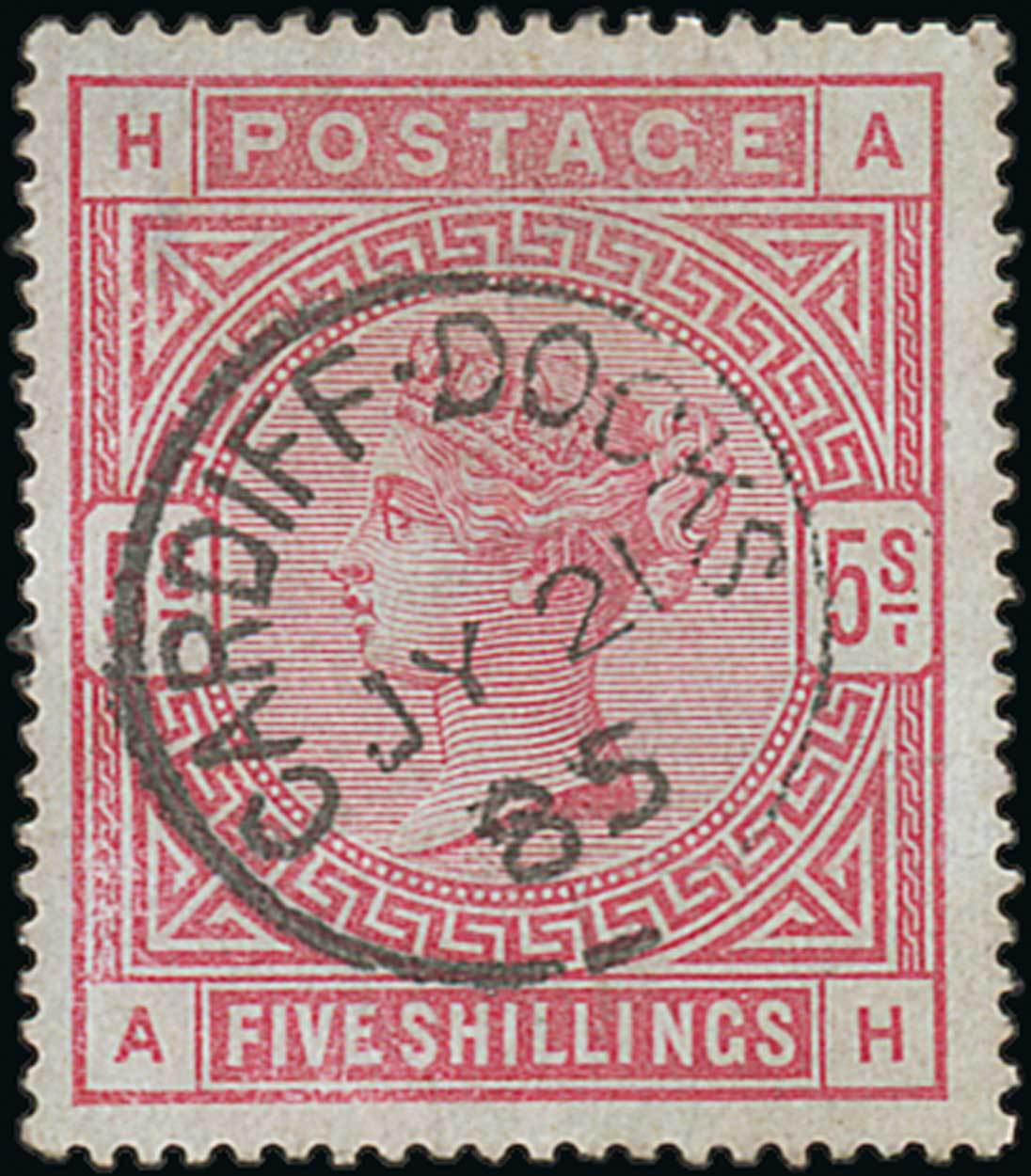 5/- rose, AH, Cardiff Docks c.d.s. of 21 July 1885, tiny thin spot, otherwise fine and attractive. S.G. 176, £4,000. Photo