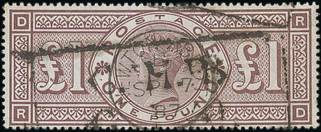 £1 brown-lilac, RD, Newton Abbot c.d.s. of 7 Sept. 1887 and boxed cancellations; good colour and fine. S.G. 185, £3,000. Photo