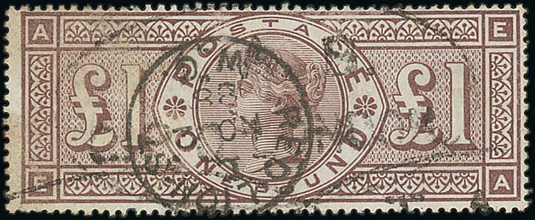 £1 brown-lilac, EA, Red Lion Square c.d.s. of Nov. 1888 and boxed cancellations, good colour and fine. S.G. 186, £4,500. S.G. 186