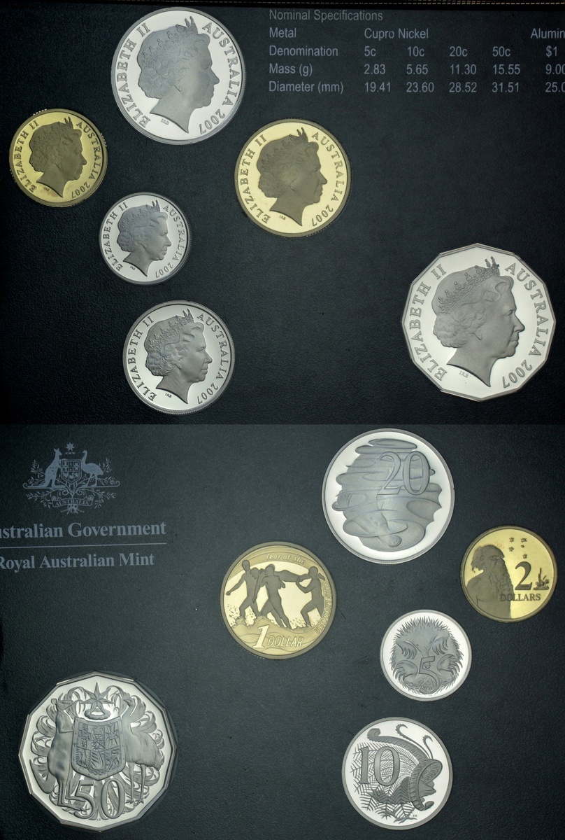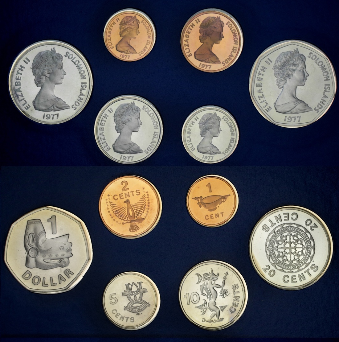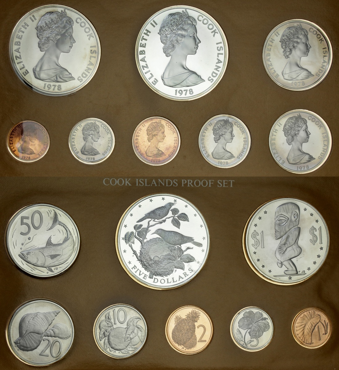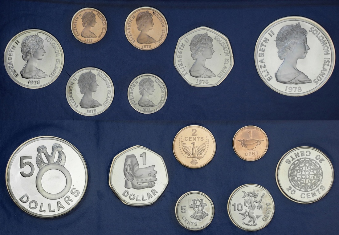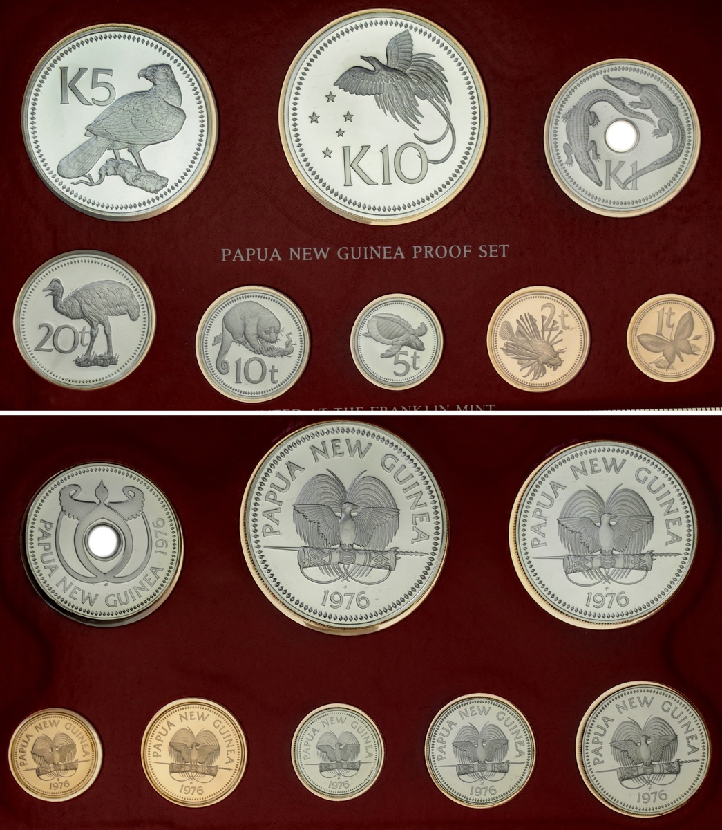 Australia and the South Pacific, Modern Proof sets, mostly by Franklin Mint (5), including, Australia, 6-Coin set, 2-Dollar to 5 Cent; also Cook Islands, 1978, 8-Coin set, .500 silver issue; also, Solomon Islands [2], First Day of Issue Presentation Set, 1977, Banknote and Coin set, 10-Dollars; 5-Dollars; 2-Dollars, and 5-Dollars to Cent [10 pieces = 7 coins]; another, 7-Coin set, 1978, 5-Dollars to Cent, in .925 silver; Papua New Guinea, 8-Coin set, 1976, 10-Kina to Toea, all brilliant uncirculated, in mint cases of issue [5 sets]