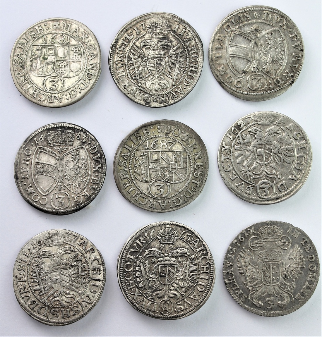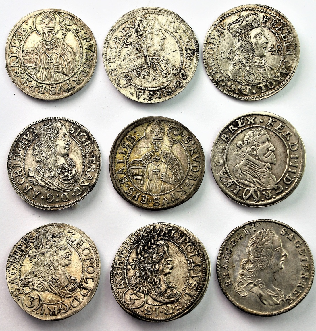 Austrian, States, 3-Kreuzers {Groschen} [9], including: Ferdinand II, Holy Roman Emperor (1619-37), 1627 (KM 584, 1231); Archduke of Further Austria [2], Ferdinand Charles, 1648 (KM 852); another, Sigismund Francis, 1665, Hall (KM 1209); also, Salzburg, Bishopric [2], Max Gandolph von Küenburg, 1681 (KM 228); another, Johann Ernst von Thunn, 1687 (KM 249; Zöttl 2220); also, Leopold I (1657-1705) [2], 1665-CA, Vienna (Herinek 1312); another, 1667, Silesia (Herinek 1314); Joseph I (1705-11), 1711-CB, Silesia (KM 690); lastly, Franz I, 1761-HA (KM 2015.1), very fine to extremely fine, a pleasing group [9]